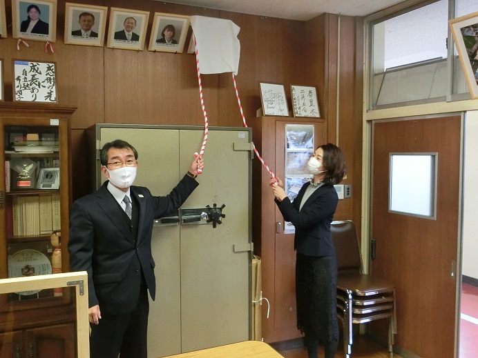 本日、校長室において前PTA会長さんの掲額式が行われました。新型コロナウイルス感染症拡大防止などを考え、機会がなく延び延びになっていましたが、現本部役員さんたちにも参加していただき行うことができました。1年間大変お世話になりありがとうございました。