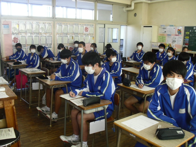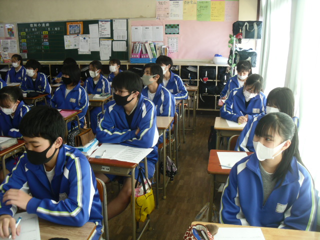 本日は、3年生が受験期に向けた食育学習を行っています。栄養教諭が来校し指導していただきました。