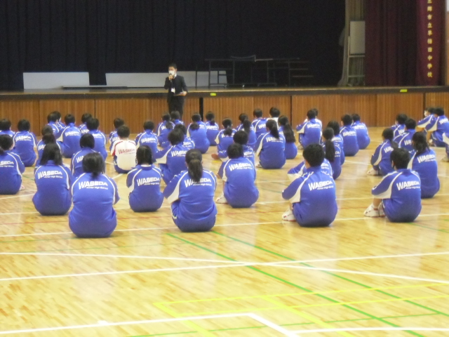 1年生は学年集会で、今学期の振り返りを学級委員から発表がありました。