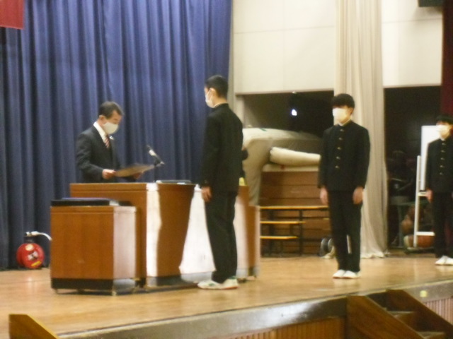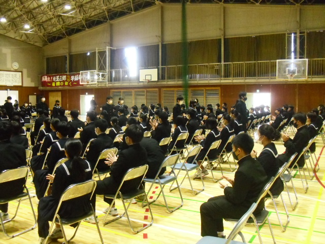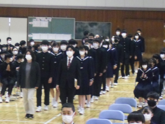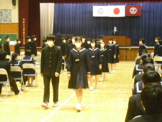 本日、卒業式予行を行いました。今年度は当日、2部制で行うため、1校時に第1部の予行を行いました。第2部の生徒は、保護者役で参加しました。そのため、当日は1部、2部で生徒たちが分かれてしまいますが、今日は、ある意味一緒に行うことができました。みんな態度が立派で当日の卒業式が楽しみです。