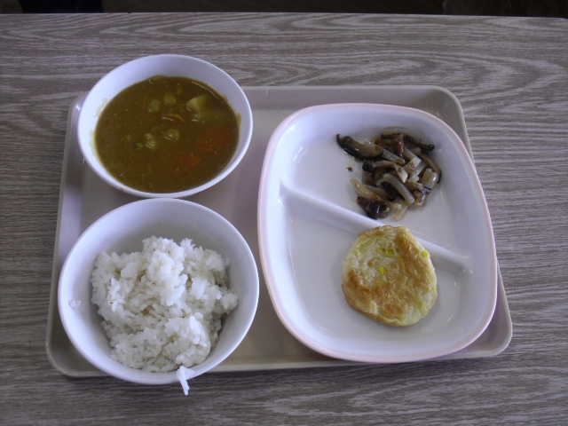 (チキンカレー、麦飯、こんにゃくのピリ辛炒め、バターコーンかまぼこ、牛乳)
