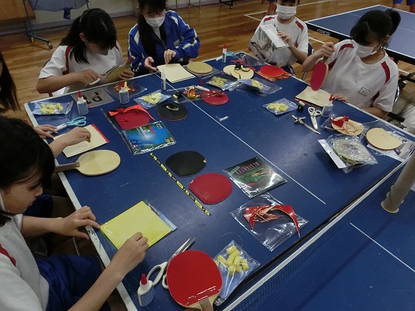 卓球部では、自らのラケットのラバーを貼り替えていました。