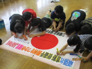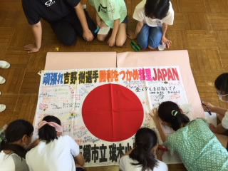 それに先駆けて、昨日の5時間目と6時間目に6年生が日の丸に応援メッセージを書き入れました。
