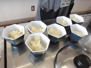 6年生が家庭科でジャガイモをゆでて、粉ふきいもを作りました。