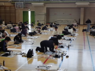 本番と同じ体育館で、しっかりと「こぶし」の字を書けた児童が多かったようです。