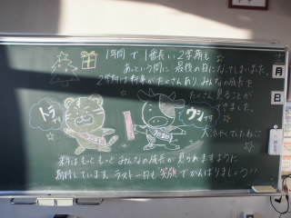 朝の黒板には、担任の先生からのメッセージが書かれていました。