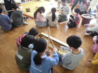 今日は、3年生の子供たちが、火おこし器を使いながら、昔の道具を楽しんでいました。