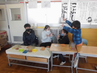 先生や子供たちがお客さんになって買い物をしたり、買い物のお会計をしたりして、学習を進めました。