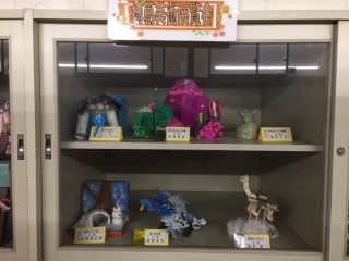 また、埼葛美術展に出品予定であった図工の作品も、職員室前の廊下の棚と、相談室前の廊下に掲示してあります。
