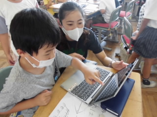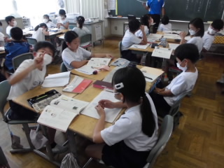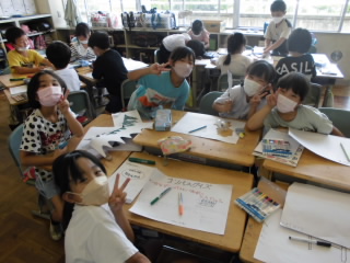 2年生は、町探検で探検したことの発表会の準備をしました。タブレットで記録した動画を見ながら、みんなと協力して準備をしていました。