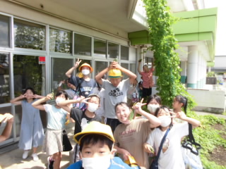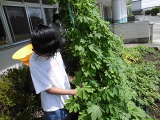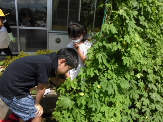 4年生が植えたゴーヤの苗が大きくなり、見事な緑のカーテンになりました。ゴーヤの実も大きくなり、水泳学習に参加していた4年生の子ども達に収穫してもらいました。