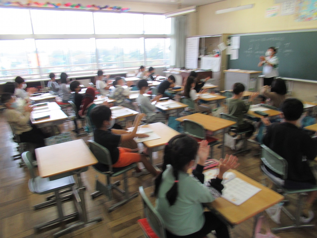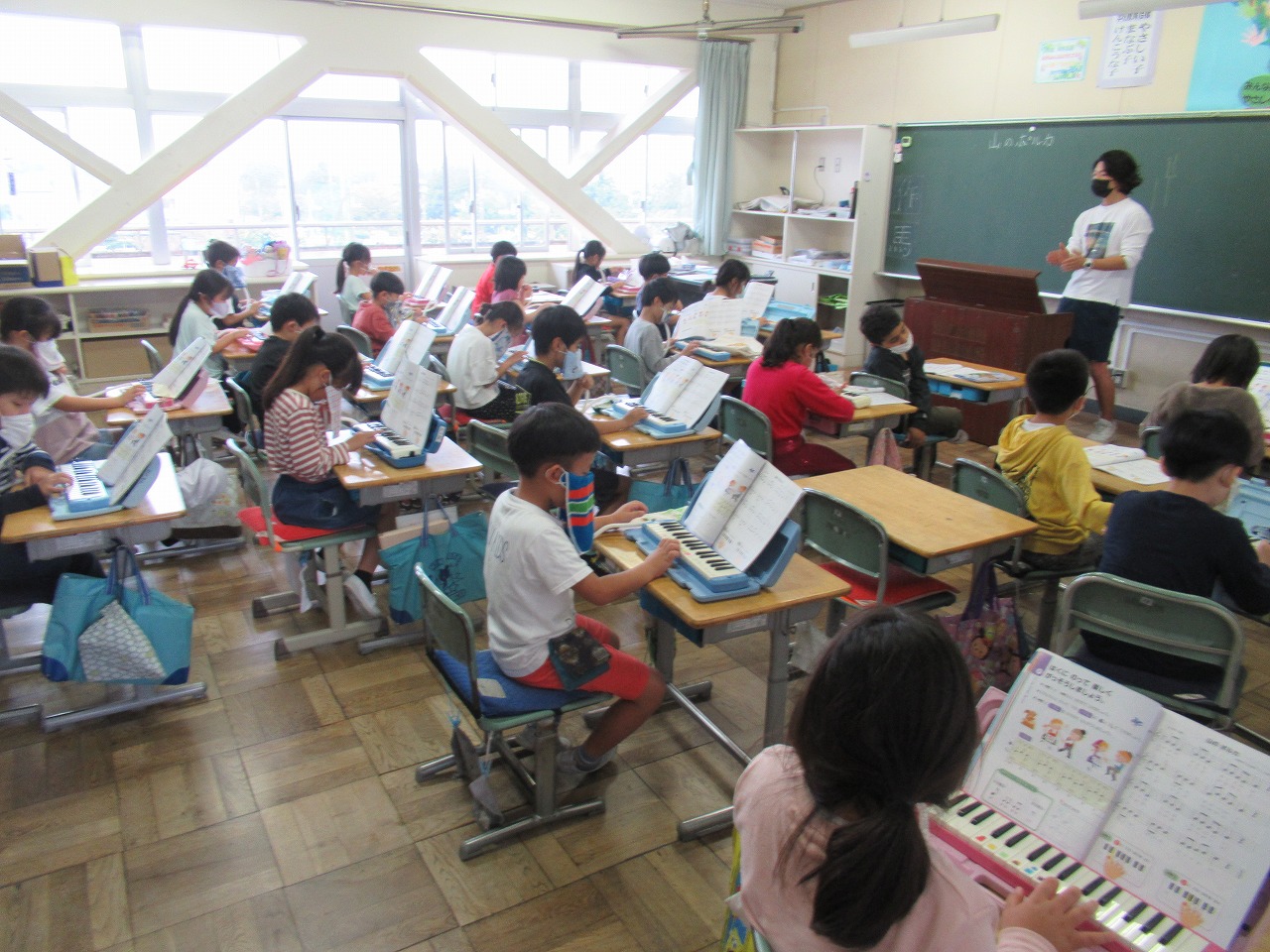 今日は特別日課でした。5時間目に2年生が音楽の授業を教室で行っていました。「リズムをかさねて楽しもう」の学習で、「山のポルカ」を手拍子でリズムをうったり、けん盤ハーモニカで演奏したりして、はくにのって、楽しくがっそうしていました。