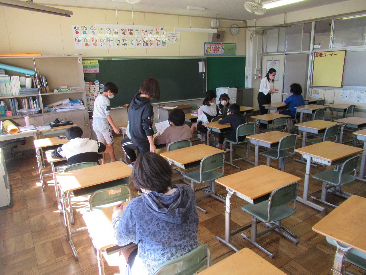 今日は、秋晴れの清々しい一日でした。子供たちの昼休みの様子です。校庭では、運動会のリレーの選手がバトンをつないで頑張って走っていました。一方、イングリッシュルームでは、スピーチコンテストの校内審査会に向けて、ALTの先生にも教えていただきながら、練習に励んでいました。目標に向かって頑張る彦郷っ子は素晴らしい限りです。