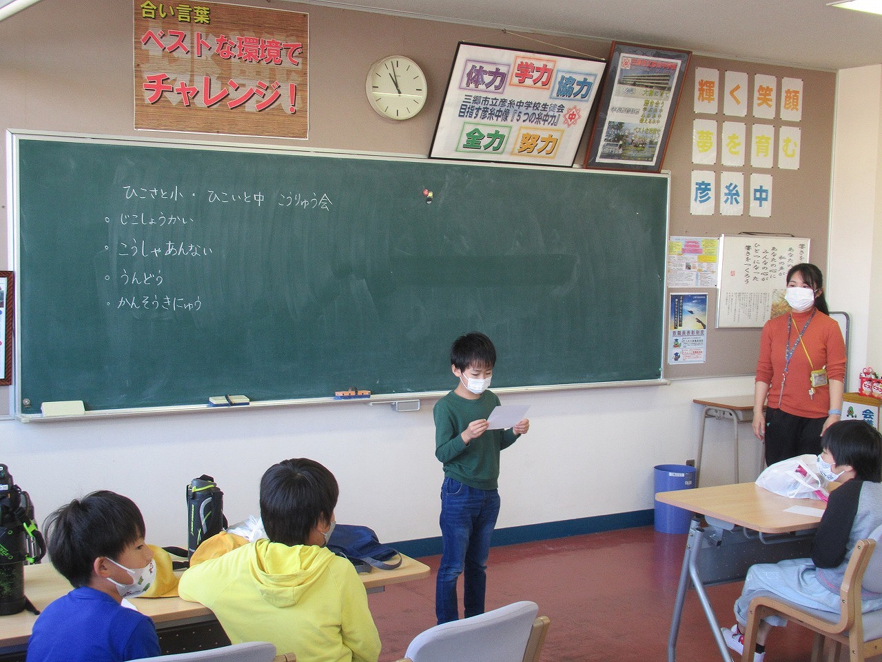 特別支援学級の交流会が行われました。子供たちは自己紹介をした後、中学校の校舎内を探検したり、体育館でドッジボールをしたりして、彦糸中学校のお姉さん、お兄さんと交流をして楽しみました。最後に感想を記入して、二人が発表もしてくれました。子供たちの笑顔から、充実した交流会になったことが感じ取れました。ありがとうございました。