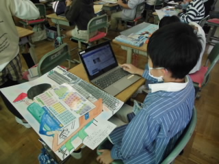 3年生は図工の学習をしていました。将来の夢をテーマに自画像を描いていました。全体的に仕上げの段階でした。出来上がった作品は、タブレットで写真を撮り、1枚のシートに画像を張り付けて、紹介文の作成をしていました。この後、スクールタクトでみんなと一緒に、作品紹介するみたいです。