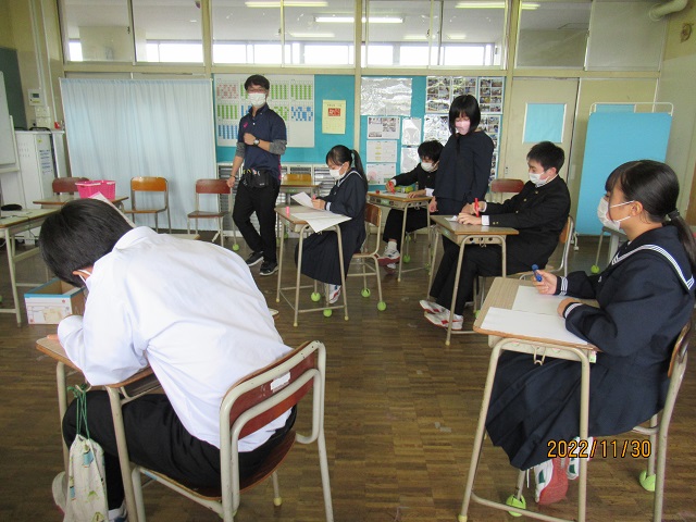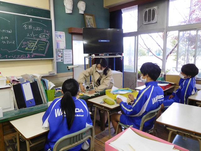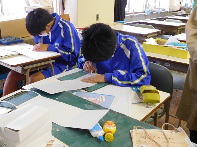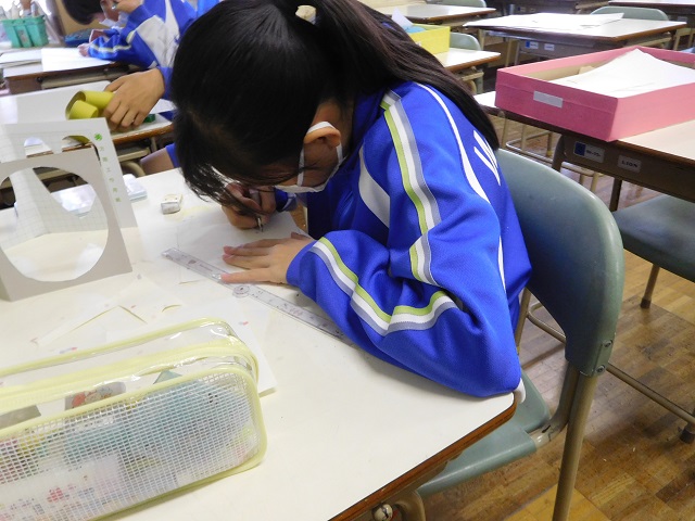 写真1~3 美術の時間、美術室でオリジナル行灯づくりです。和の文様を活用しながら製作中です!