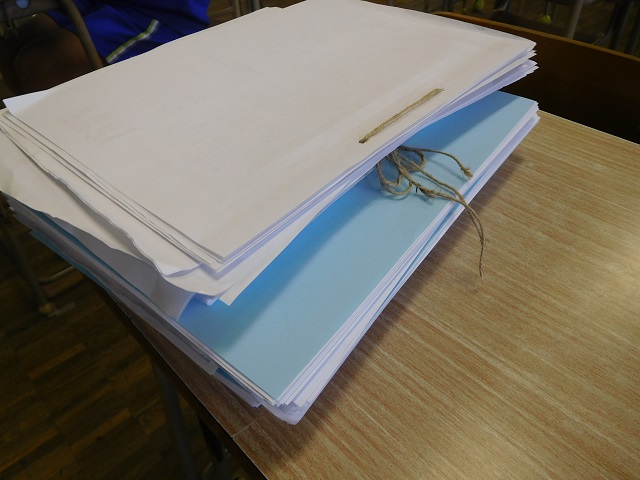 写真5~7 終業式前日の学級活動です。これまで取り組んだ学習プリントを紐で綴じこんでいます。たくさん勉強しましたね!!