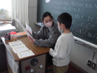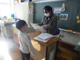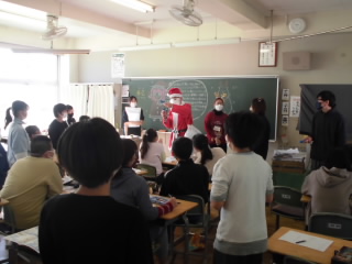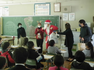 子供達は、2学期のあゆみを担任の先生からもらっていました。頑張った子、成績が上がった子など、2学期の頑張りを一人一人丁寧に担任の先生から説明を受けていました。そんな中、教室に鈴の音が聞こえたかと思ったら、なんと!!サンタクロースがプレゼントをもって遊びに来てくれました!!サプライズ登場に子供達は大喜び!!校長先生、よかったですね!!