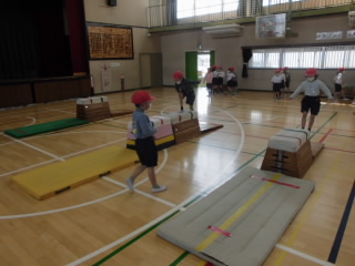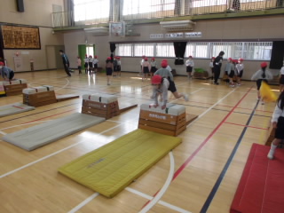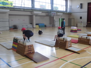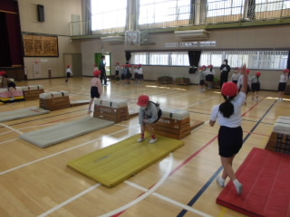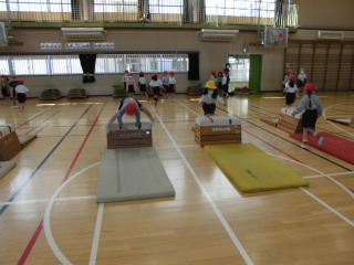 1年生は、とび箱の学習で「開脚跳び」ができるように一生懸命練習しています。怖がらないように、様々な場が用意されており、楽しみながら取り組んでいます。なんと、校長先生も授業の応援に駆けつけてくださいました!!きっとできる!!最後まで諦めずに挑戦してほしいです。ファイト!!