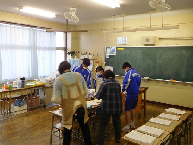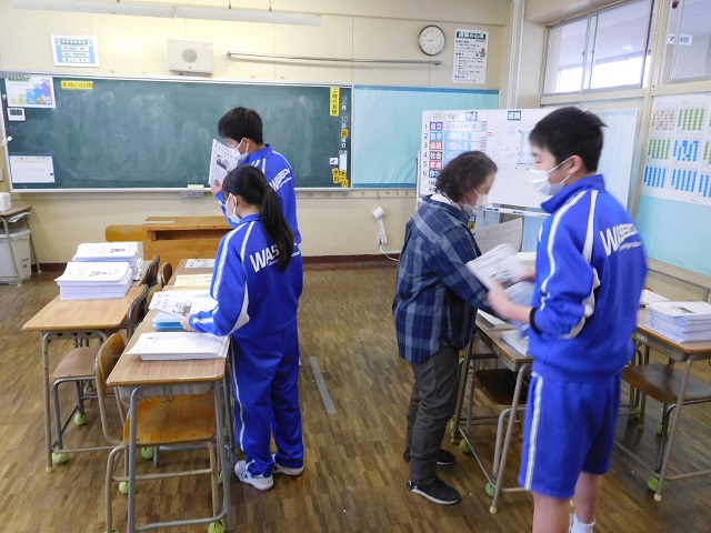 写真1・2 作業学習の時間、早中お助け隊出動です!新入生説明会の資料綴じこみをお手伝いしました。