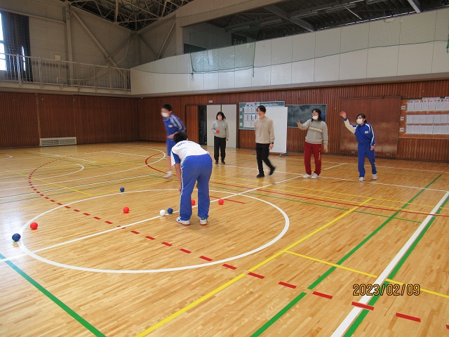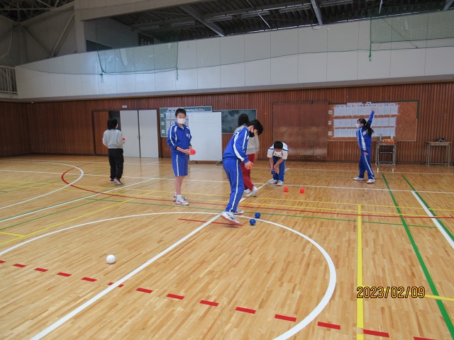 写真5・6 体育の時間、ボッチャに取り組みました。先生チームと7・8組チームに分かれて対決です。今回はT先生の大活躍で先生チームが勝利です!!