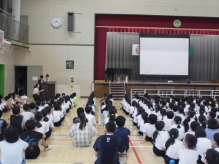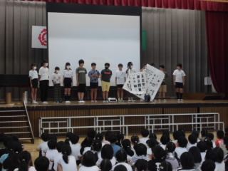 今日は児童集会がありました。今回の集会は図書委員会が発表を行いました。