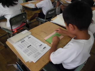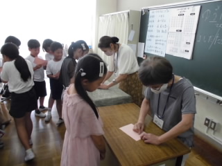 4年生による総合的な学習の授業では、目に障害をお持ちの方をお招きし、普段の生活の様子や点字の打ち方について教えていただきました。子供たちは、自分の名前を点字で表していました。