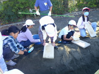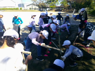 4年生の社会の学習で、見沼代用水の学習をしています。今から約300年前、機械もない時代に人力で用水路をどのように造ったのか、実際に砂場で体験しました。