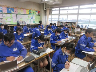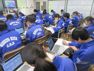 3年生の理科では、授業の導入で今日の天気図と、埼玉県公立入試に出題されたことがある天気図を比較、まず、ワンポイント入試対策を行いました。その後は、「水質汚染と大気汚染」について、各自テーマを決めてのレポート作成です。このような力がこれからの時代を上手く生きるために、必要な力になります。