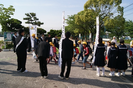 さわやかな学校生活は、朝の元気なあいさつから始まります。彦郷小学校では毎朝、「朝のあいさつ運動」を行っています。それに加え、第4水曜日は、彦糸中学校区青少年健全育成の取り組みとして、小学校中学校、地域保護者の皆様の協力のもと、あいさつ運動を実施しています。25日(水)には、彦糸中の先生方、生徒会・陸上部・野球部の生徒20名が正門前に並んで「元気は声に乗せて」を合い言葉に、いっしょに朝のあいさつ運動を行いました。 あいさつの輪が広がるよう毎朝の取り組みを続けていきます。