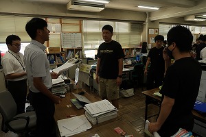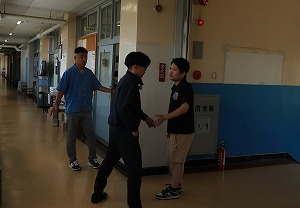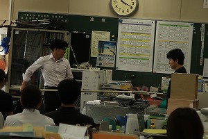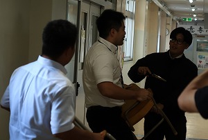 今日は、久しぶりに全員が集まって「不審者対応訓練教員研修」を行いました。吉川警察署の方にお越しいただき、「不審者が刃物をもって、北校舎3階の廊下に侵入」という設定で、実際に不審者が校内に現れた時にどのように対応したらよいか、さすまた等の道具を活用して対応訓練を行いました。