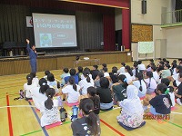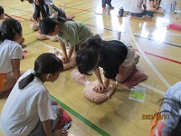 9月1日は防災の日です。その防災の日に合わせて、5年生が救急救命講習会に参加しました。三郷市消防本部の消防士の方を講師にお招きし、人形を使用した心肺蘇生や、動画を閲覧して初期の対応が大切であることを学びました。