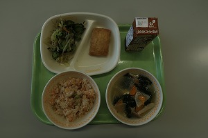 中でも「3色ご飯」は、鮭フレーク(赤)、炒り卵(黄)、枝豆(緑)と彩りもよく、多くの生徒から人気のメニューです。コーヒー牛乳も加わって、楽しい給食時間となりました。