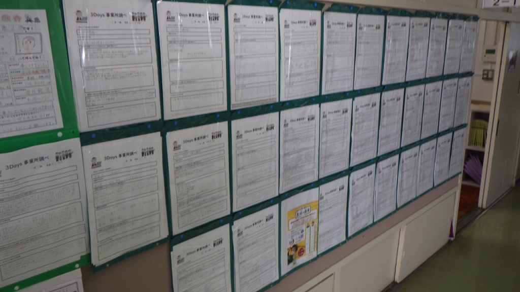 2年生は、職場体験学習に向けて事業所調べレポートを掲示しました。