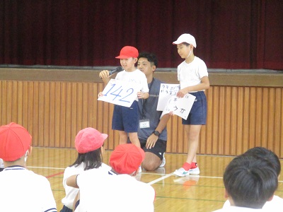 戸ケ崎小学校は。「じゃんけん列車」のレクリエーションゲームと「戸ケ崎小学校クイズ」を担当しました。