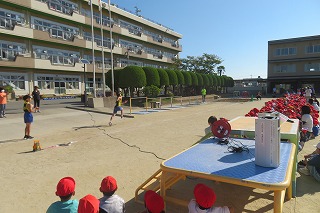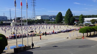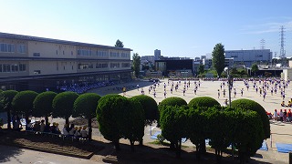 全校児童と全職員がグランドに集まり、試技をする6年生に声援を送りました。