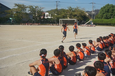 秋晴れの下、陸上記録会に向けた選手壮行会を、代表委員会のメンバーの運営でおはようタイムの時間に開催しました。