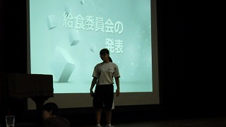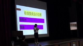生徒集会が行われ、給食委員会の発表と南中祭のスローガンの発表がありました。