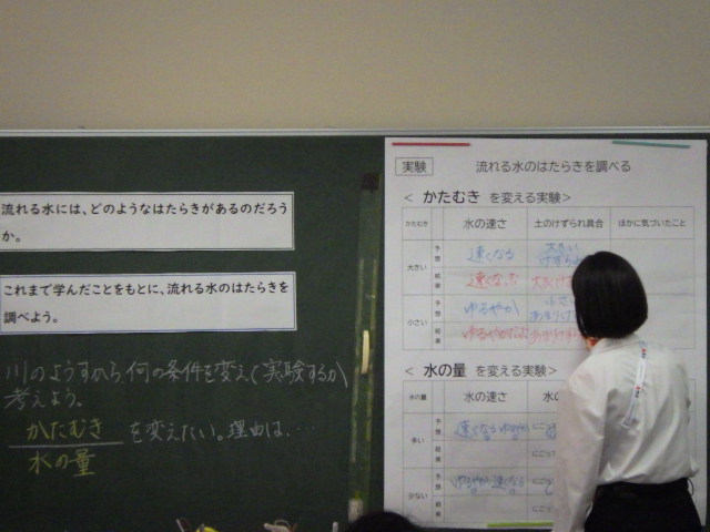 5年生の理科の授業の様子です。「流れる水のはたらきを考えよう」の学習では、予想を立てて、実験をしました。水のの量や地面の傾きを変えるとどのようになるか、考えながら取り組みました。