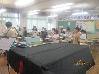 音楽の授業では、4年生が髙橋先生の指揮のもと素敵な歌声を響かせていました。曲名は、「とんび」(葛原しげる 作詞・梁田貞 作曲)です。