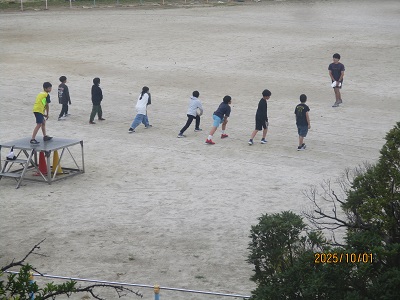 今日は、開会式の時に準備運動のお手本を示すための練習です。初めのうちは、今一つの動きでしたが、先生に指導を受けながら徐々に精度を上げてきました。