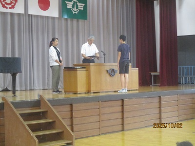 10月の全校朝会は、表彰と生活目標、校長講和の3つの内容です。