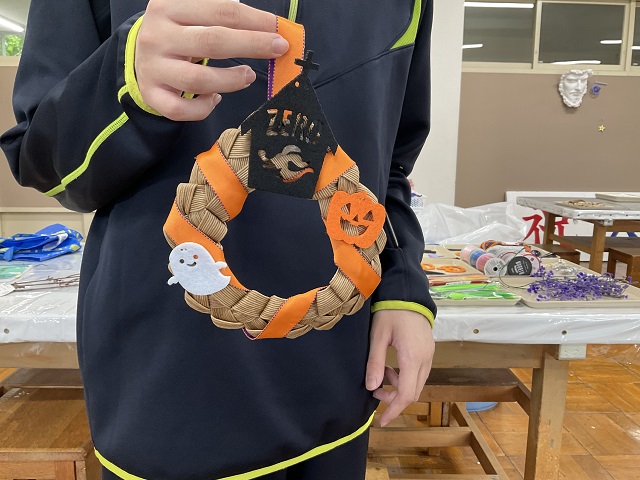 美術の時間に紙バンドを使ってリース作りを行いました。ハロウィン飾りもつけて、上手に仕上がりました!!