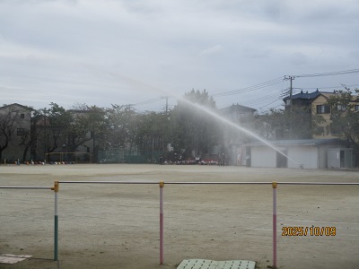 子供たちの元気は、風を吹き飛ばす勢いでしたが、砂埃が待っていましたので途中に休憩をとり、その間にスプリンクラーで水をまき砂埃を抑える対応を取りました。大玉送りの時には砂埃が舞うことなく、練習をすることができました。