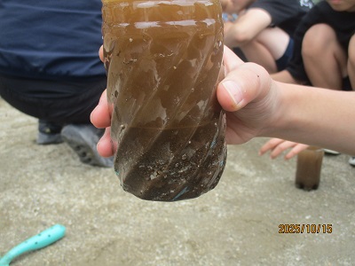 先生が畑の土を水の入った大きなバケツに入れて、実験用の土を作ります。子供たちはその土を、500mlぐらいのペットボトルの上部3分の1ぐらい切ったものに入れます。すると、ものの見事に砂や土の粒が地層のように堆積します。写真で見ればふーんと過ぎてしまいそうなことが、実際にやってみると理解度が格段に違ってきます。