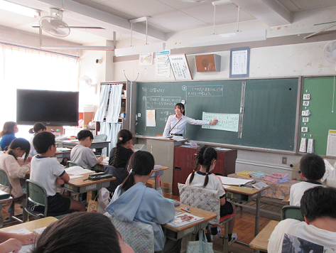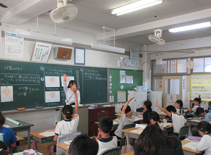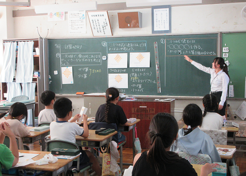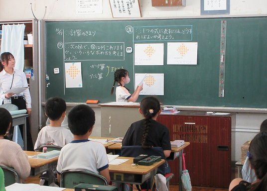 4年生の算数で、研究授業を行いました。「計算のきまり」の単元です。「1つの式に表すには、どうすればよいか考えよう。」という課題で学習しました。ドットの数の求め方を図や式を用いて考え、説明することができました。