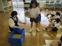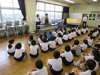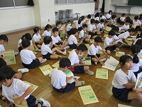 三郷市の1年生は、入学のお祝いとして事前に希望した本が1冊もらえます。この日は、北部図書館の方々がその本を届けてくれました。一人ひとり、自分で選んだ本を受け取っている様子です。どんな本に出合えたのでしょうか。