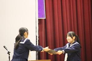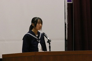 最後に、新生徒会役員の皆さんへ。今は不安や緊張もあるかもしれません。私も一年前同じ気持ちでした。悩んだり迷ったり、時には失敗した時もありました。けれど、この学校には、温かく支えてくれる仲間がいます。そんな仲間と共に、7人の力を惜しまず出し切って、さらに北中を引っ張っていってください。これからも生徒の皆さんの意見や行動で北中学校は少しずつ変わっていくはずです。だからこそ、これまで先輩方が築いてきた伝統や想いも、どうか大切に受け継いでいってほしいと思います。改めて一年間本当にありがとうございました。