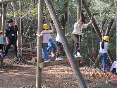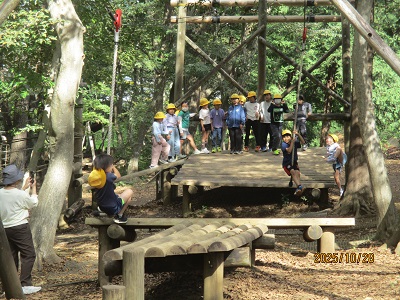 アスレチックも、思う存分の体験でした。初めは一人一人の単独行動でしたが、挑戦コースが難しくなってくると、声を掛け合ったり手助けし合ったりと、こちらも微笑ましい場面が大変多くありました。