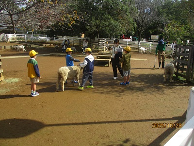 到着後の初めの体験学習は、「どうぶつふれあい広場」でヤギ・ヒツジ、ウサギ、モルモットとふれあいができました。